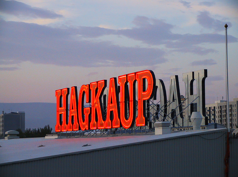 HAGKAUP logo. Open neon. Reykjavik, Iceland