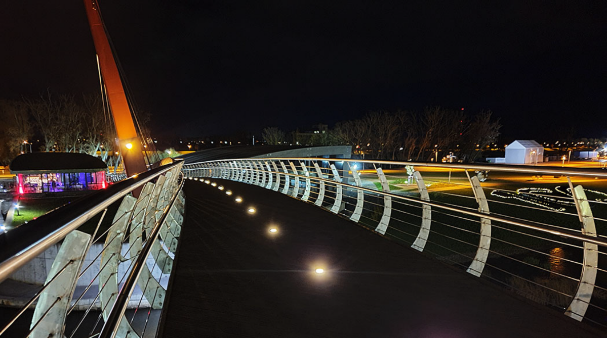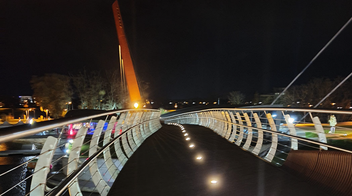 Gājēju tilta dekoratīvajam apgaismojumam mēs izmantojām LED gaismekļus, kas izvietoti tilta virsmas pārklājuma līmenī.