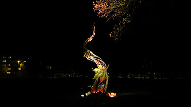 Внутри красного купола, находящегося в основании памятника и символизирующего костер, были установлены светодиодные модули, запрограммированные по заданному сценарию. Таким образом, при дневном свете свечение «костра» как бы пульсирует, а в темноте мерцающий свет поднимается по изгибам центральной части конструкции.