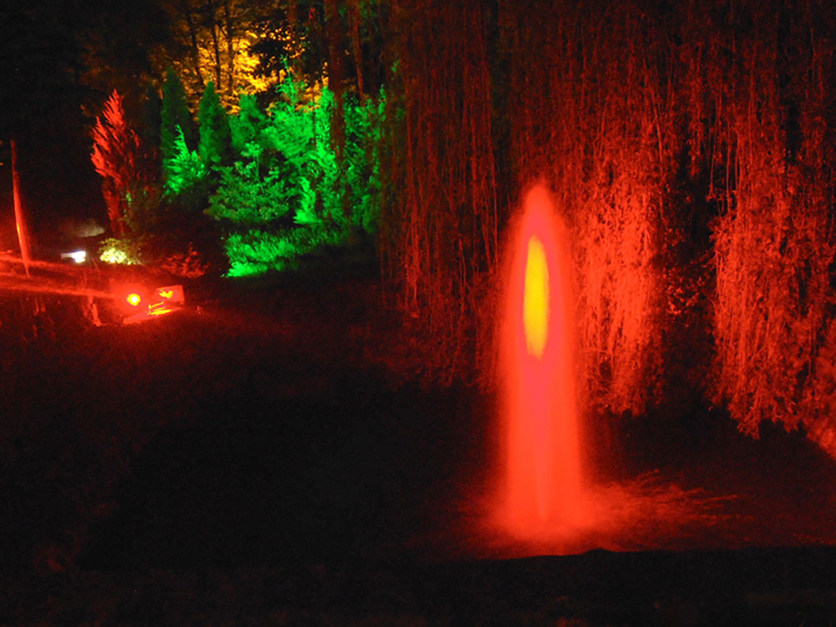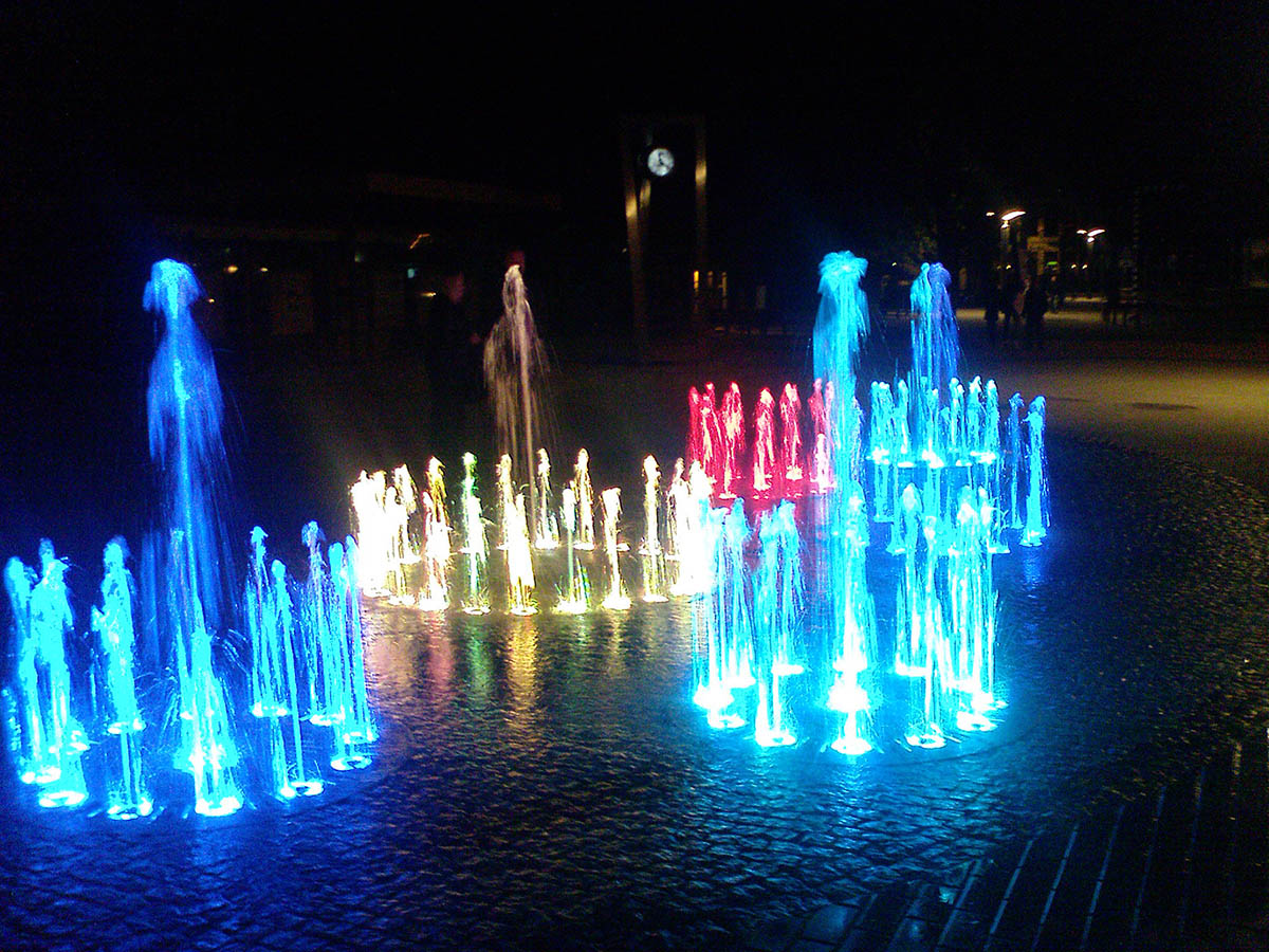 Dzintari koncertzāles strūklaku dinamiskais RGB apgaismojums. Jūrmala, Latvija