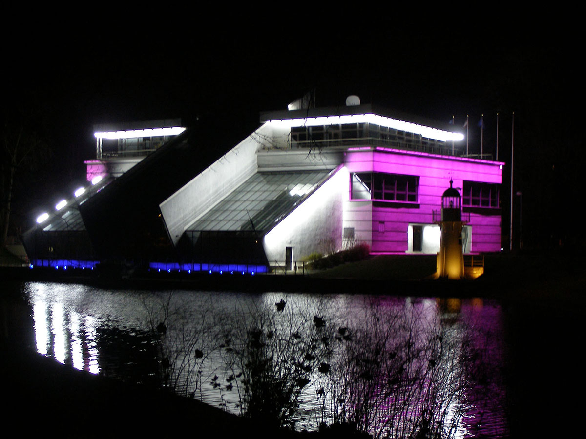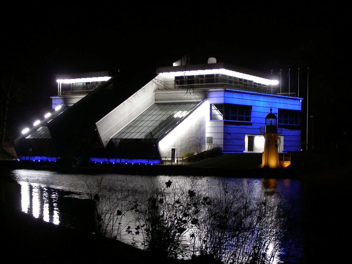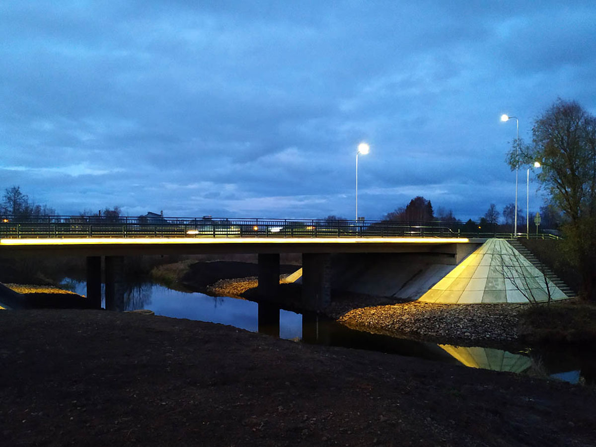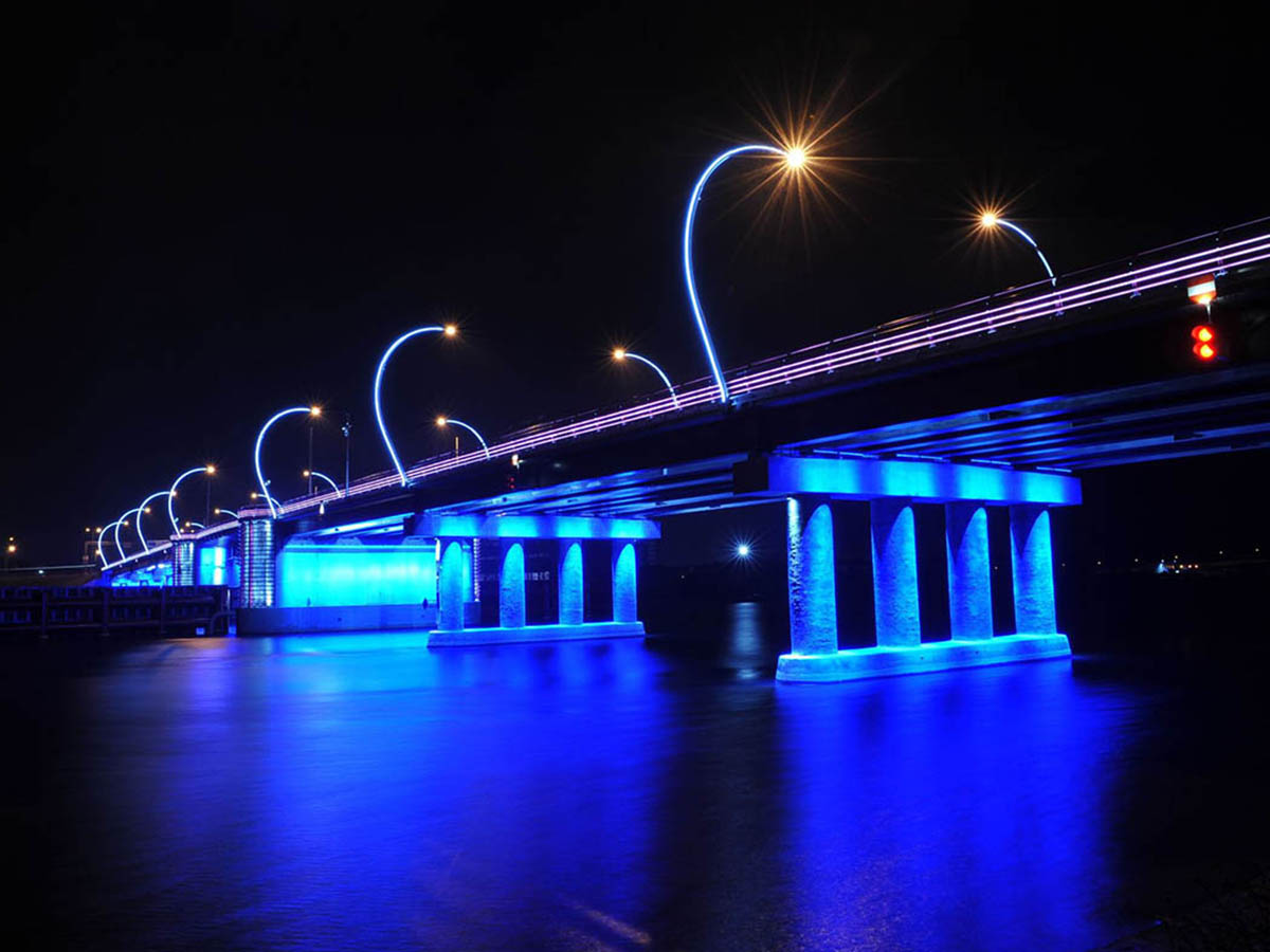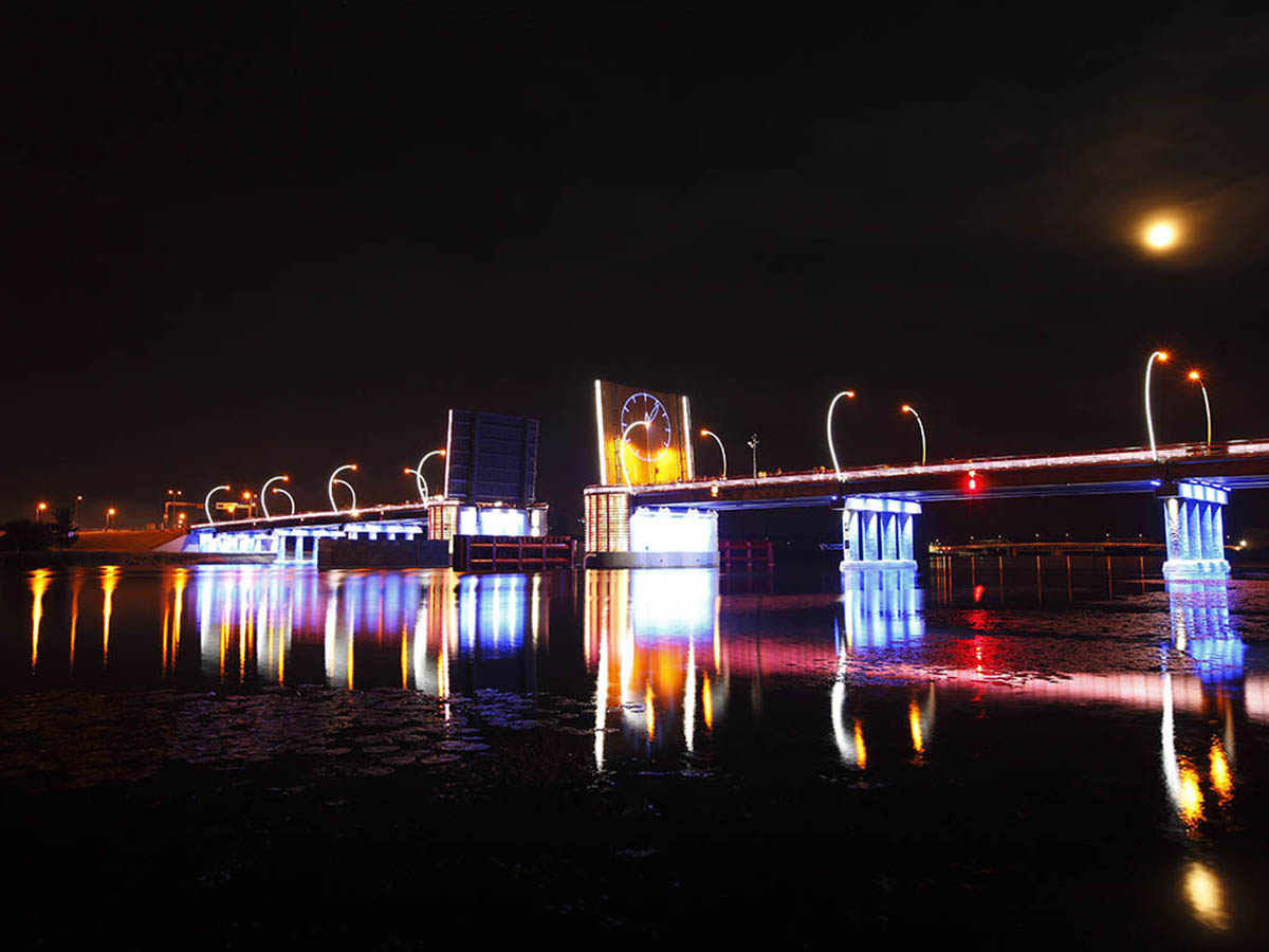 Dynamic illumination of the bridge across the Venta River. Ventspils, Latvia