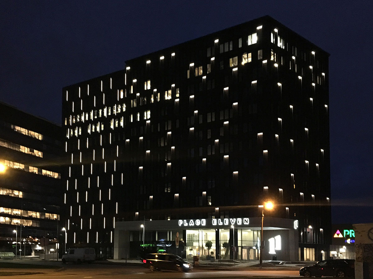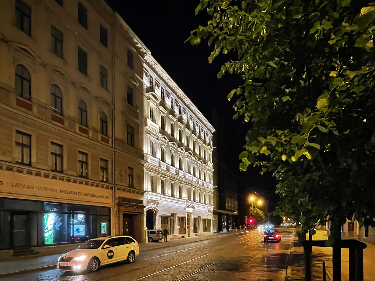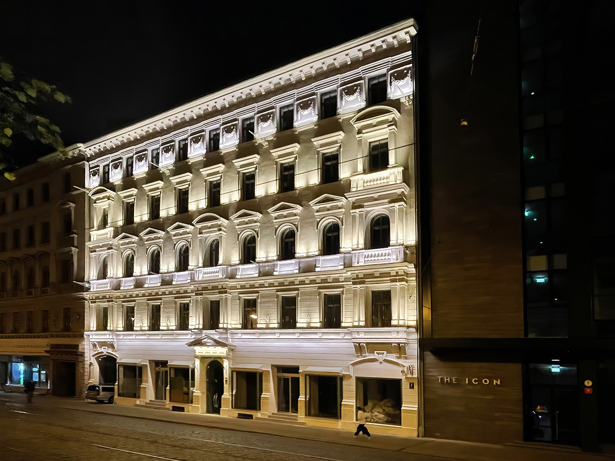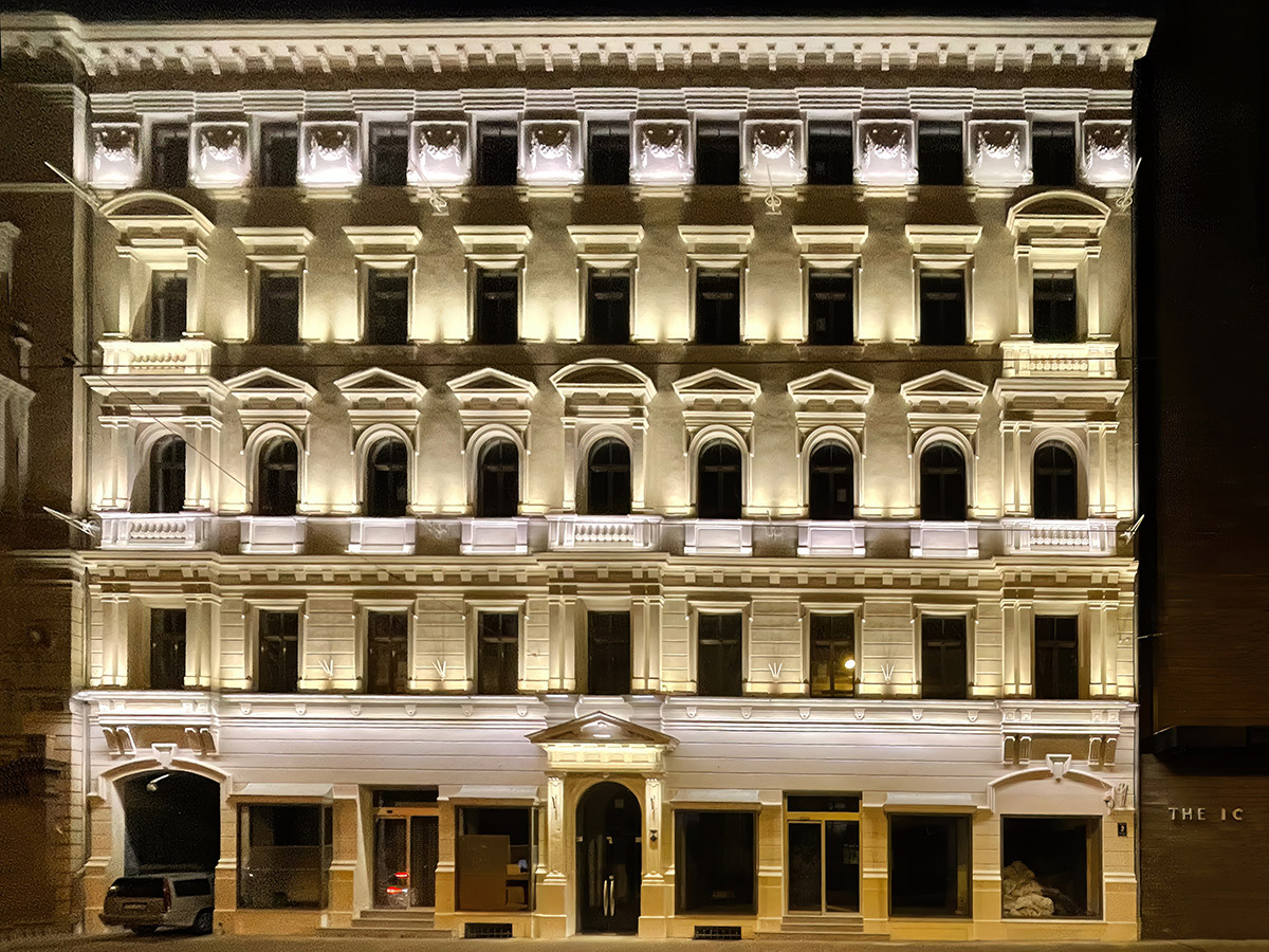 Fasādes apgaismojums. Mednieku 7. Rīga, Latvija