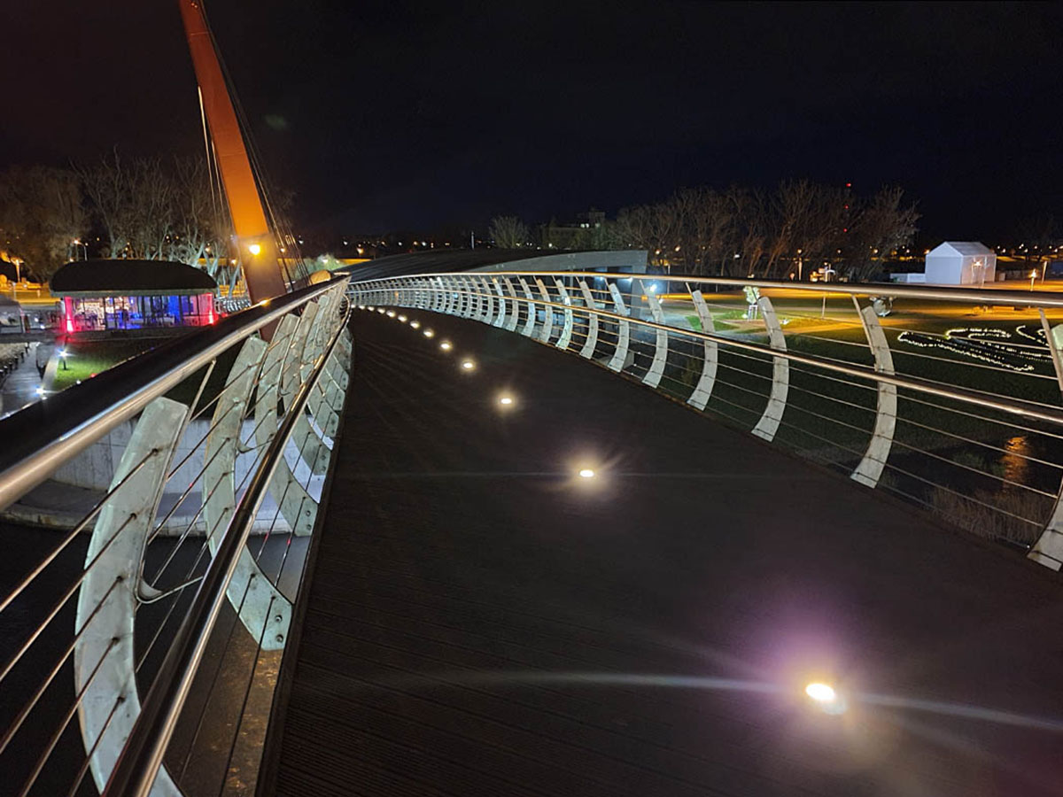 Gājēju tilts pār Mitavas upi. Virsmā padziļināti LED gaismekļi. Jelgava, Latvija