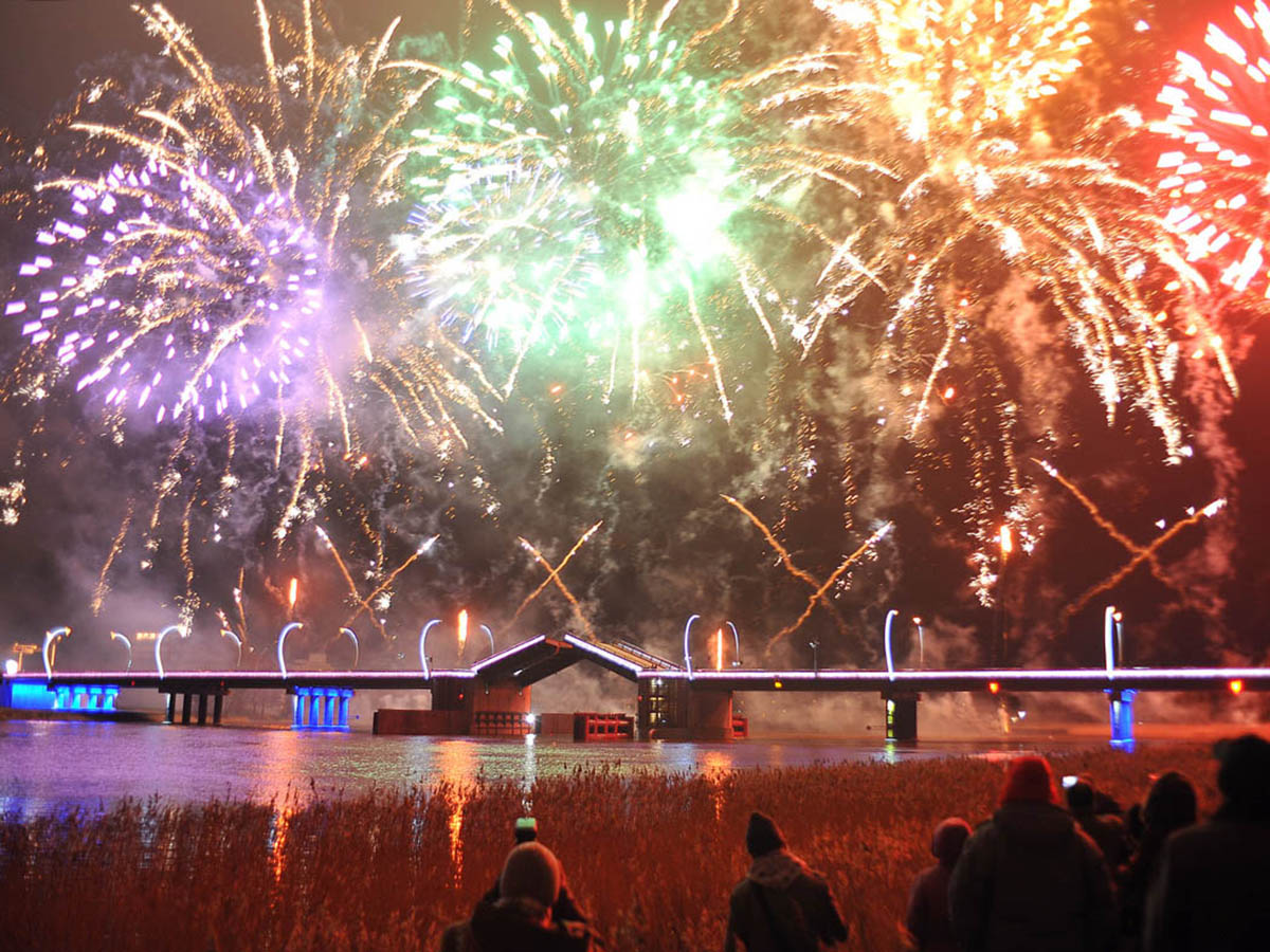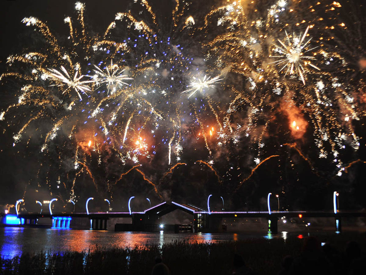Dynamic illumination of the bridge across the Venta River. Opening. Ventspils, Latvia