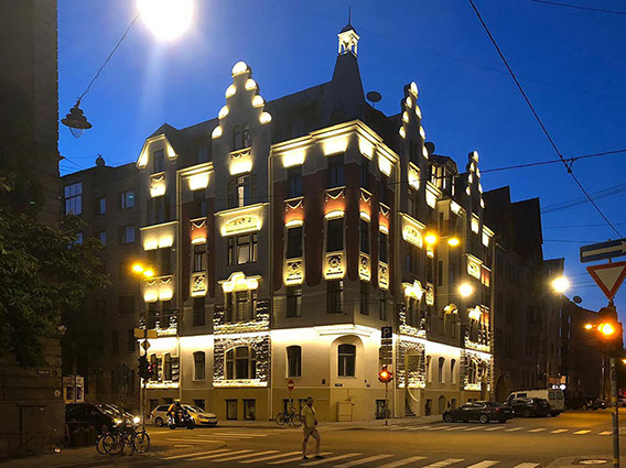 The facade of the building has a large number of elements possible for light accents, allowing you to see the beauty of architecture also in the dark. To solve this problem, the most suitable light sources are linear fixtures with ellipse optics, which evenly illuminates relief decorations, stone cladding and other elements of the building. At the same time, linear fixtures minimally draws attention to the structural parts of the fixtures themselves.