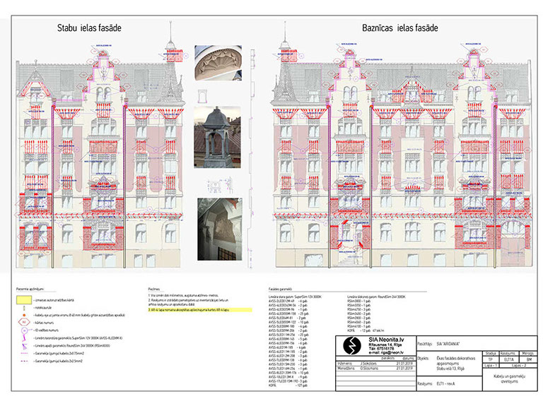Some of them highlight relief elements on the facade, others create two accent light belts that give visual completeness to the facade lighting.